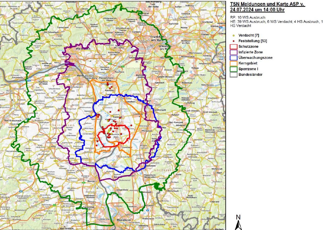 De Kreis Bergstraße is getroffen. Voor het eerst werd ASP aangetroffen bij een dood wild zwijn in de Kreis Bergstraße, volgens “Hessenschau”. De resten werden door een boer ontdekt, en het Landeslabor in Gießen bevestigde een voorlopig positief resultaat. Ook in de Landkreis Groß-Gerau zijn nieuwe uitbraken bij varkens gemeld. Grote delen van de Kreis Bergstraße en aangrenzende gebieden in Baden-Württemberg vallen nu in sperrzones, waar strikte maatregelen gelden, zoals een jachtverbod en beperkingen voor varkenshouders.